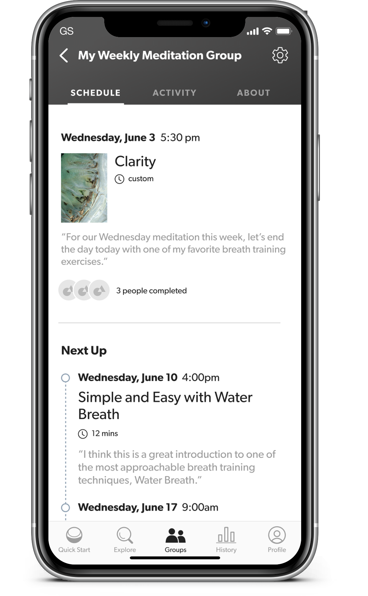 - The Schedule is where the group leader can suggest meditations for the rest of the group: by scheduling them for a specific date and time, or simply as unscheduled recommendations. Each day you'll be able to see which group members have completed any meditations that were scheduled for today.