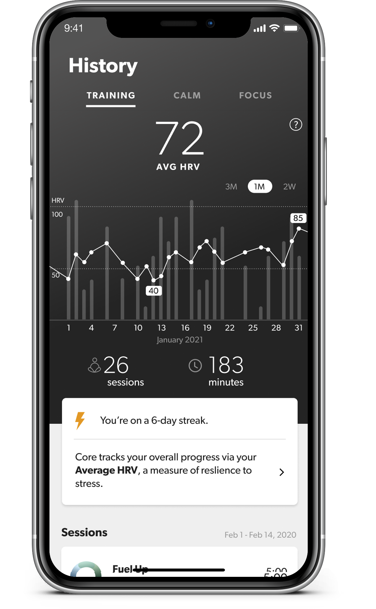 The Training view is focused on how much time you’ve spent meditating, and the overall trend in your Heart Rate Variability (HRV.) This is one of the most important biometric measurements that Core uses.