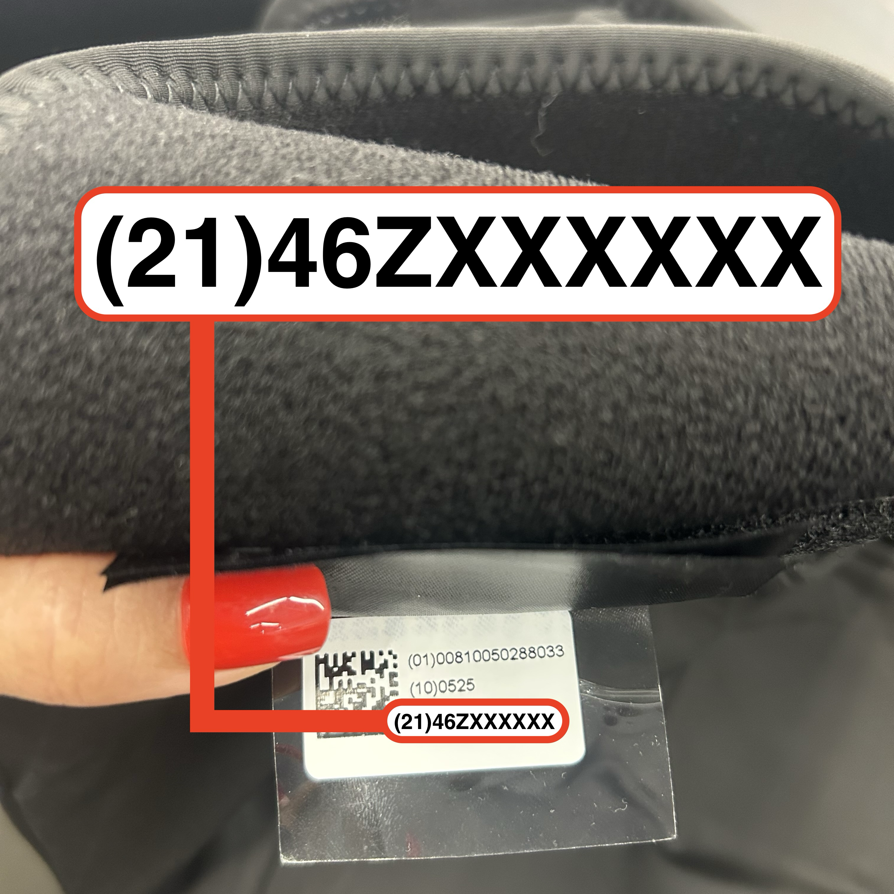 Hyperice X Knee: 9 digit number printed on the tag near the upper thigh